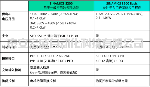 SINAMICS S200伺服驅(qū)動器分為Basic版和標(biāo)準(zhǔn)版,可滿足各種應(yīng)用需求。關(guān)于供電及電壓范圍、安全功能、制動電阻、控制接口、交流輸入檢測及抱閘控制幾方面的說明,請參看表2-1。